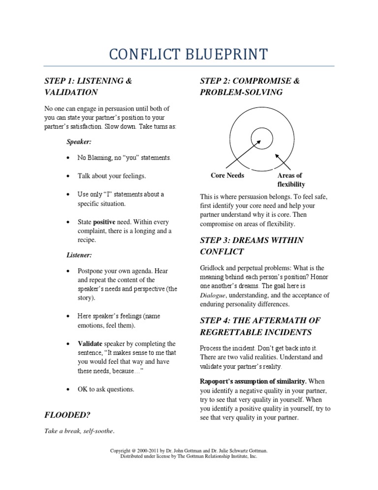 Gottman Conflict Resolution Worksheet - Distributed under license by the gottman institute, inc. Recall and name your emotions during the conflict 2. An important event (e.g., changes in job or residence, the loss of a job or loved one, an. Identify your deeper triggers 4. Discuss the subjective reality of both partners 3. Distributed under license by the gottman institute, inc.