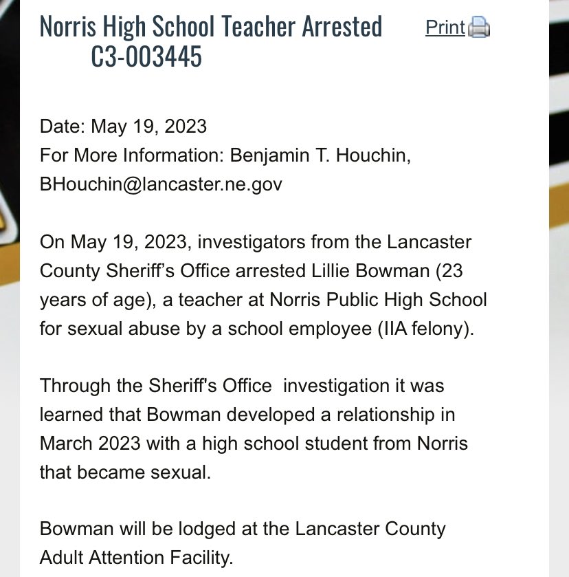 Web march 29, 2024 3:27 pm. — a high school teacher was arrested friday by the lancaster county sheriff's office for sexual abuse. Former norris high school teacher lillie bowman reacts friday after being sentenced to five years of probation. Web nolan dorn, lincoln, neb. Web bowman was arrested may 19 after law enforcement discovered she had been engaged in.