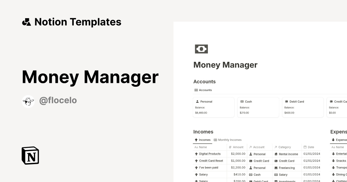 Money Manager Template by Flocelo Notion Marketplace