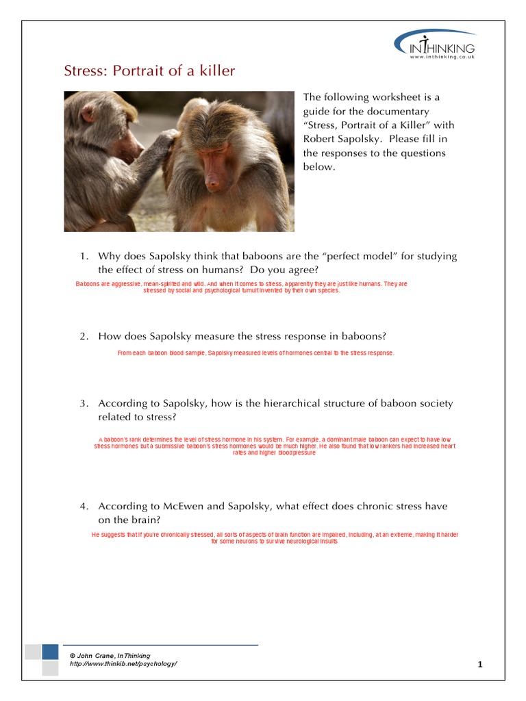 Stress Portrait Of A Killer Worksheet - List three things stress can do to your body and/or brain. Describe the link between stress and stomach ulcers. Describe the research linking chronic and acute stress to memory. Carol shively's research on stress in macaque monkeys reveal about the effects of stress? Study with quizlet and memorize flashcards containing terms like where does sapolsky bring his lab, why did he choose baboons, stress. What two hormones are the backbone to the stress response? Chronic stress causes brain cell.