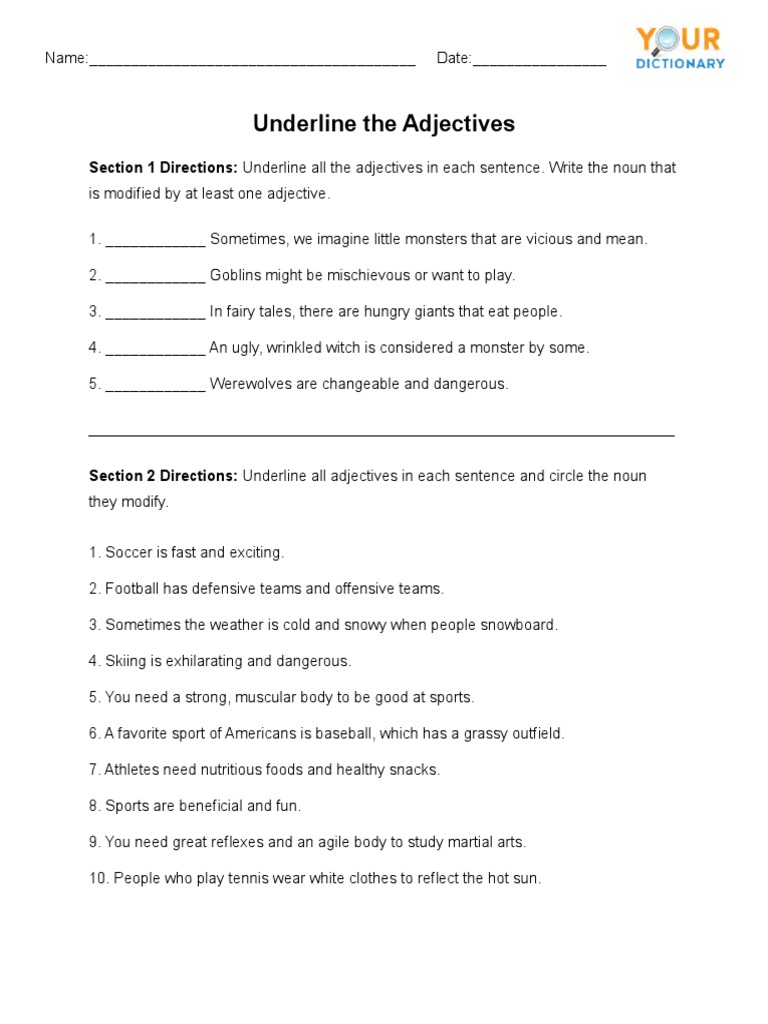 Underline Adjectives Worksheet PDF Adjective Grammar